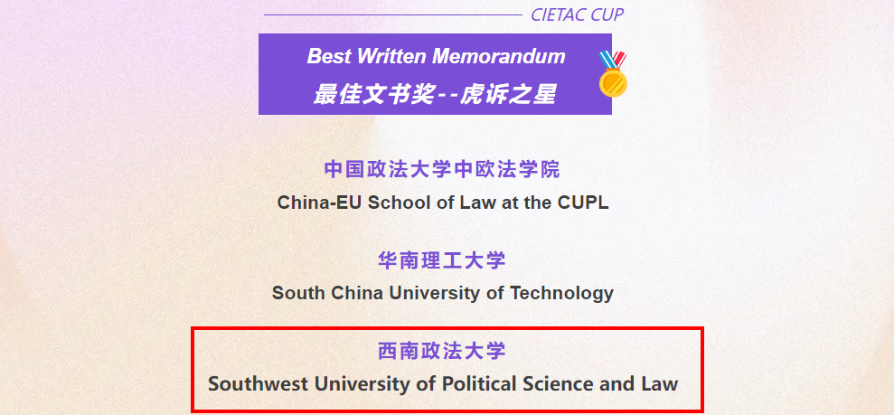 西政代表队荣获第二十二届“贸仲杯”最佳文书奖及全国二等奖