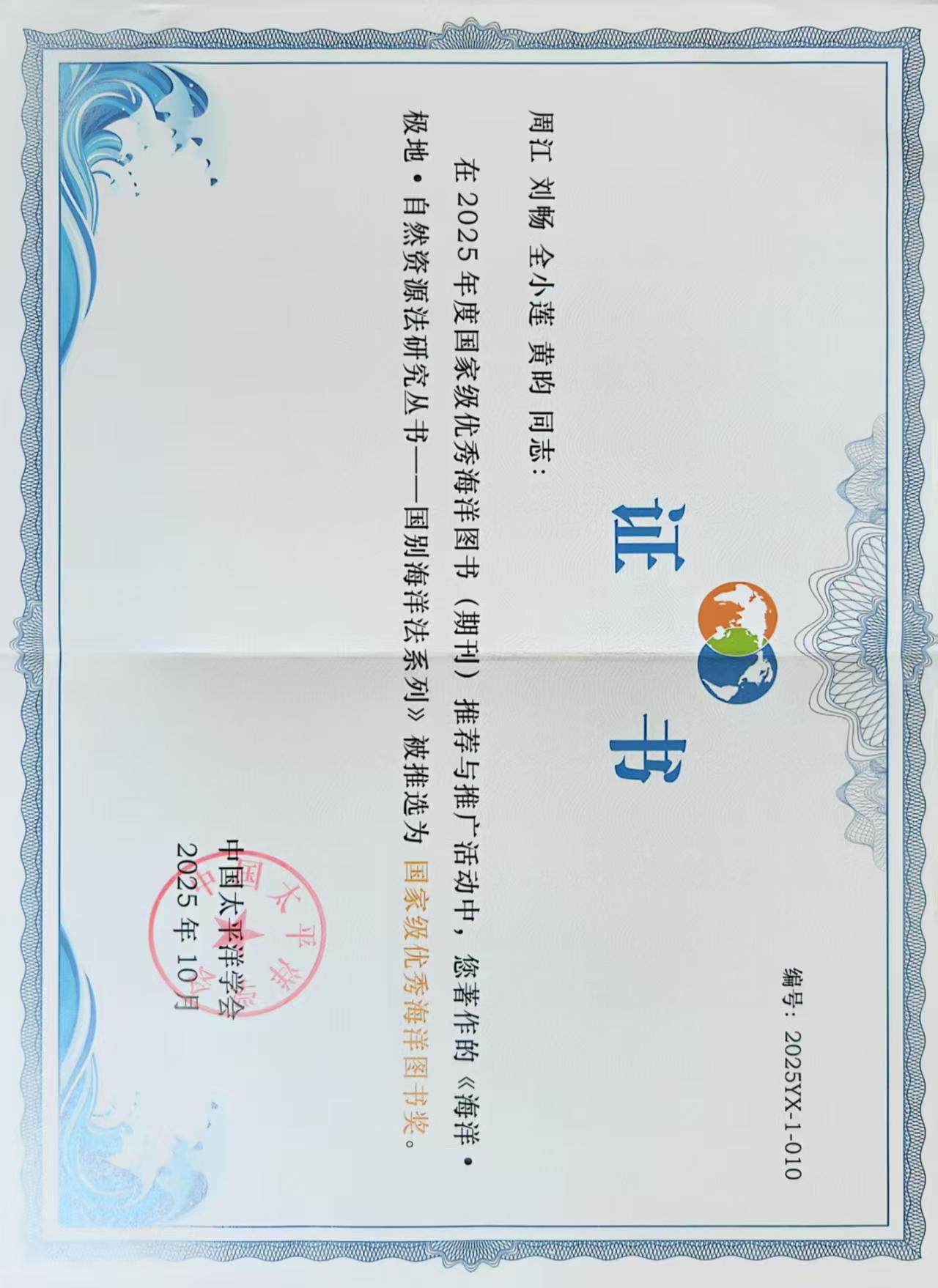 “海洋•极地•自然资源法研究丛书——国别海洋法系列”获2025年“国家级优秀海洋图书奖”